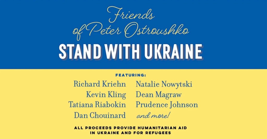 Tuesday February 24, Fridley: A fundraiser for Ukraine in the Main Stage Room at Crooners on the 4th anniversary of the Russian invasion of Crimea, and the 5th anniversary of the death of beloved local musician Peter Ostroushko. Hosted by Prudence Johnson and featuring lots of Peter’s music from Natalie Nowytski, Tatiana Riabokin, Kevin Kling, Dean Magraw, Richard Kriehn and the Minneapolis Mandolin Quartet.